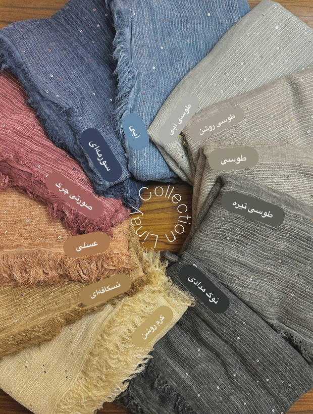 / کرم روشن / سبز تیره / آبی روشن / آبی آسمانی / سورمه ای / طوسی روشن / طوسی / نوک مدادی / صورتی چرک / عسلی / طوسی تیره / نسکافه ای